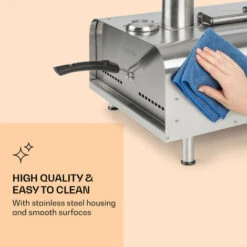 The finest gourmet experiences without electricity: the unique Diavolo pizza oven from Klarstein enables you to prepare aromatic dishes with real fire. Whether pizza, oven bread, meat, vegetables or cakes – baked in a traditional method but with the latest pellet oven technology – it tastes unique. Place the Diavolo outdoors, fill the back with wood pellets and bring it to the desired temperature. The integrated thermometer reliably shows you the exact heat, while the stainless steel housing ensures rapid heat distribution and the distinctive chimney ensures good smoke extraction.