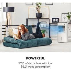 FULL MOBILITY AROUND THE HOME: The 36.5 W evaporative air cooler unit works freely in any room – no exhaust hose needed. The wide AC 90° oscillation leaves no corner without cold air, providing necessary ventilation to cool everyone on summer days.