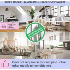 FULL MOBILITY AROUND THE HOME: The 65 W evaporative air cooler unit works freely in any room – no exhaust hose needed. The wide 90° oscillation leaves no corner without cooled air, providing necessary ventilation to cool everyone on summer days.