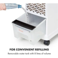 The air cooling function is operated with the help of the water in the removable and refillable 8-litre water tank, and activated by pressing the snowflake symbol on the touch user interface. The ambient air is cooled by means of water evaporation: the 3-in-1 air cooler draws in warm air from the back of the device and directs it through the evaporator. The water is extracted from the heat and the escaping airflow becomes colder. This brings refreshment to the body with every activity. At the same time, the air humidity rises, making the device ideal for dry indoor air. The cooling effect can be enhanced by using ice cubes or ice packs.