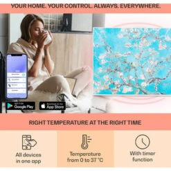 The Klarstein Wonderwall Air Art Smart infrared heater combines highly efficient heating power with attractive design and the latest technology. The 80 x 60 cm heating panel can be hung directly on the wall, is only 5 cm high and hardly bigger than a framed picture. With its powerful 500 Watt output and owing to IR ComfortHeat it spreads very pleasant heat for the human skin without getting lost in the air. Thanks to infrared technology, the heating panel is extremely energy-efficient and environmentally friendly, as a full 98 % of the power is converted into radiant heat. Smart functions for control via app, thermostat, auto switch-off function and IP44 protection class skilfully round off the innovation.